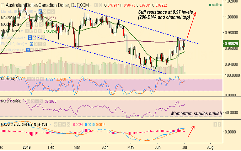 - Technically, AUD/CAD finds stiff resistance at 0.97 levels (channel top and 200-DMA).