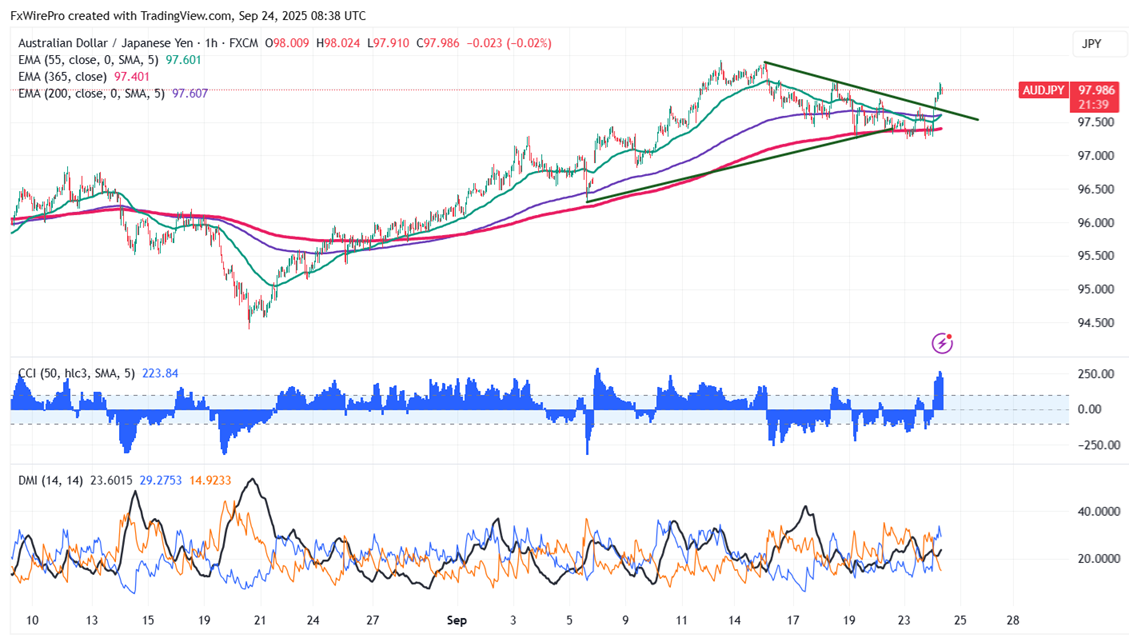 The pair is trading below 55 and 200 EMA and 365 EMA (long-term) on the 1-hour chart, confirming a bullish trend. Any close below 97.60 indicates the intraday trend is weak. A dip to 97/96.75/96.30/96/ 95.50/95/94.40/93.95/93 is possible. Immediate resistance is at 98.20, a breach above this level targets 98.50/98.75/100/100.42.