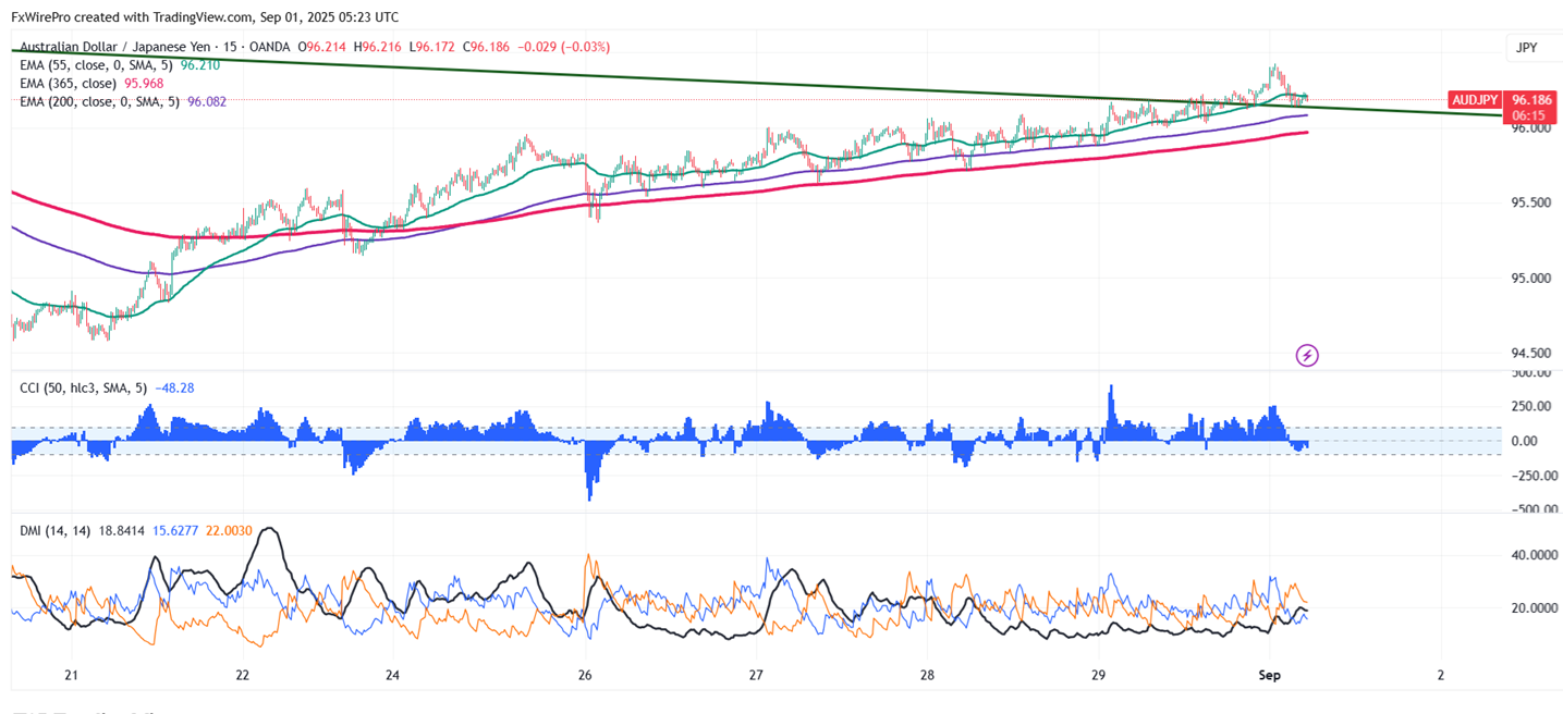 The pair is trading above 55 and 200 EMA and below 365 EMA (long-term) on the 15-min chart, confirming a bullish trend. Any violation below 96 indicates the intraday trend is weak. A dip to 95.50/95/94.40/93.95/93 is possible. Immediate resistance is at 96.20, a breach above this level targets 96.50/96.85/97.20/97.64/98.