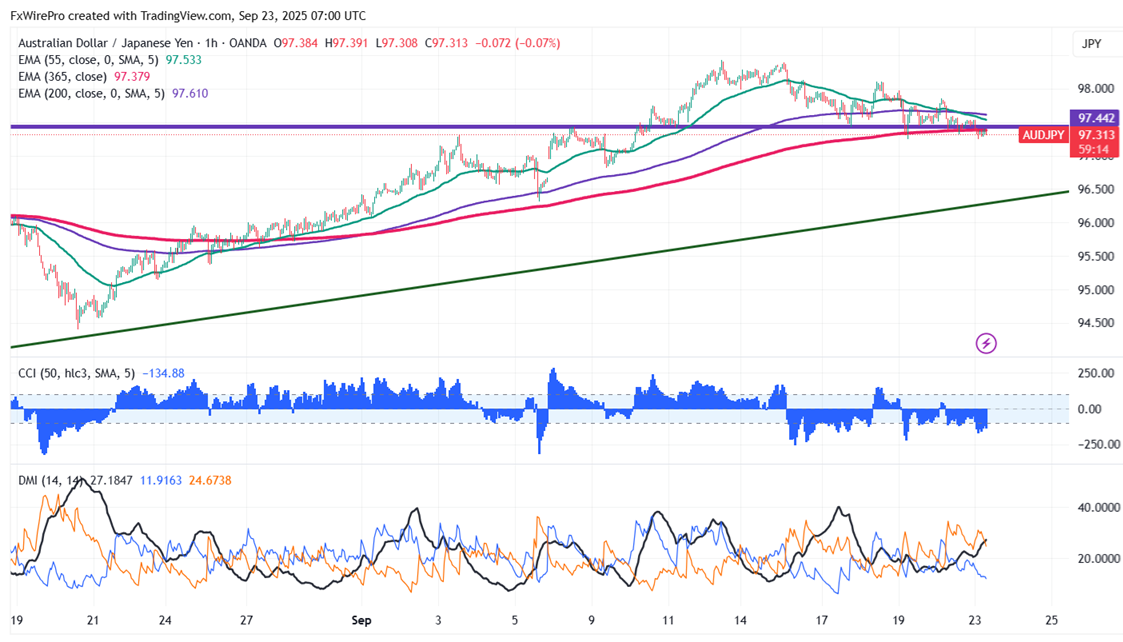 The pair is trading below 55 and 200 EMA and 365 EMA (long-term) on the 1-hour chart, confirming a bearish trend. Any close below 97.20 indicates a weak intraday trend. A dip to 97/96.75/96.30/96/ 95.50/95/94.40/93.95/93 is possible. Immediate resistance is at 98, a breach above this level targets 98.50/98.75/100/100.42.