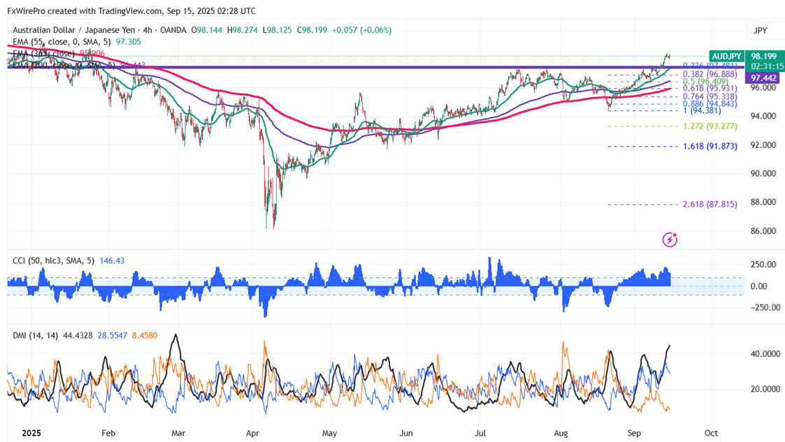 The pair is trading above 55 and 200 EMA and 365 EMA (long-term) on the 4-hour chart, confirming a bullish trend. Any violation below 97.90 indicates the intraday trend is weak. A dip to 97.48/97/96.75/96.30/96/ 95.50/95/94.40/93.95/93 is possible. Immediate resistance is at 98.50, a breach above this level targets 98.75/100/100.42.