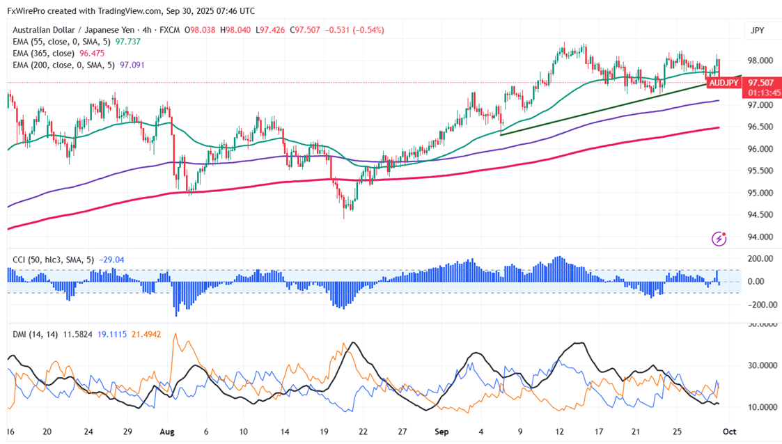 The pair is trading above the 55 and 200 EMA (long-term) on the 4-hour chart, confirming a bullish trend. Any close below 97.65 indicates the intraday trend is weak. A dip to 97.25/96.75/96.30/96/ 95.50/95/94.40/93.95/93 is possible. Immediate resistance is at 98.20, a breach above this level targets 98.50/98.75/100/100.42.
