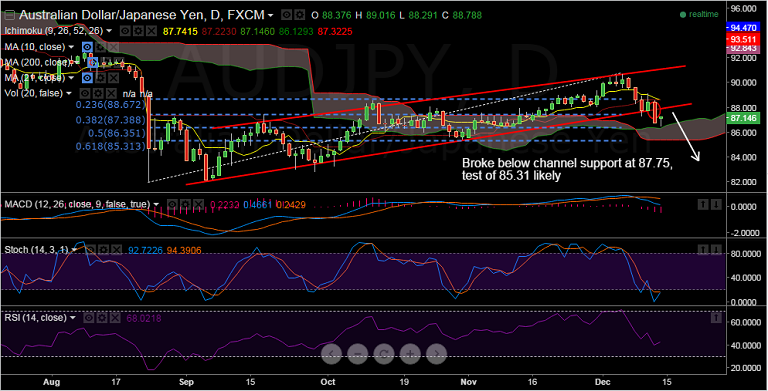 - Immediate support for the pair is seen at 86.51 (Session low Dec 14) and further below at 86.35 (50% Fib of 81.97 to 90.72 rise).