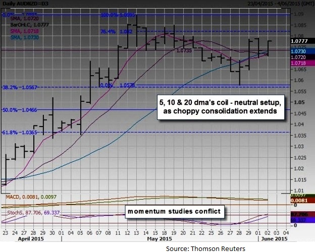 Doji into RBA, but some component volatility, RBA statement Momentum studies conflict, 5, 10 & 20 dma's twist, neutral setup Initial support levels are at 1.0735 and 1.0710, resistance at 1.0820