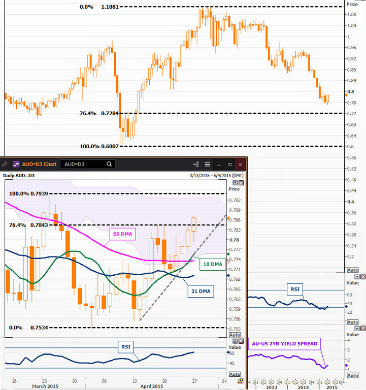 - New trend high hit (0.7870) with very little pullback as yield spreads widen