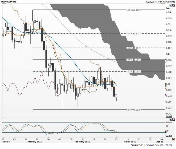 New trend lows at 0.7684 but prices rebound intraday There is a cluster of good resistance points in the upper 0.7700s 21 DMA at 0.7790, 10 DMA at 0.7795 and the tenkan-sen line at 0.7799 Short in play with profits locked in at 0.7795