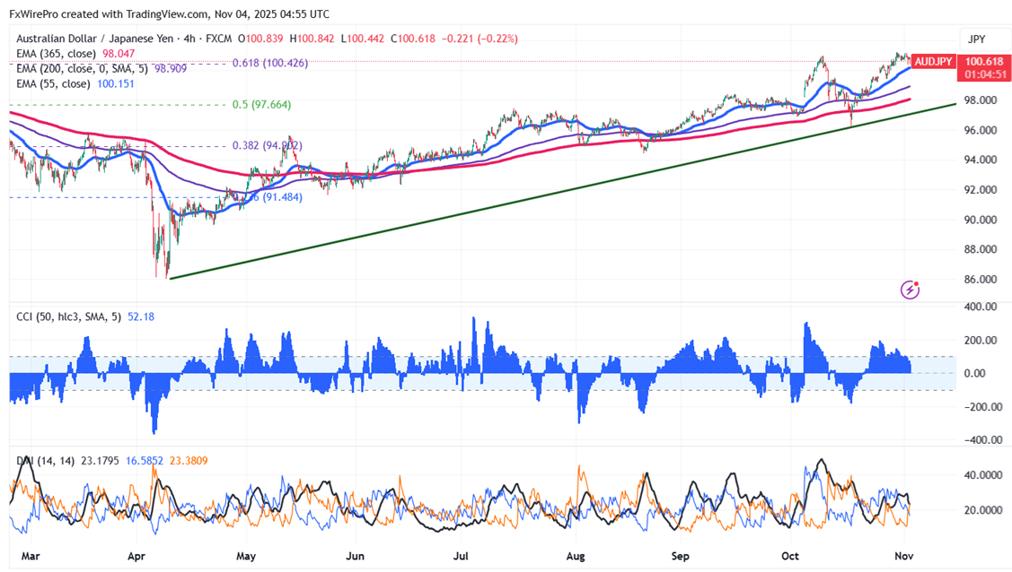 AUDJPY showed a minor pullback RBA monetary policy. It hits an intraday low of 100.44 and is currently trading around 100.55. Intraday trend remains bullish as long as support 100 holds.