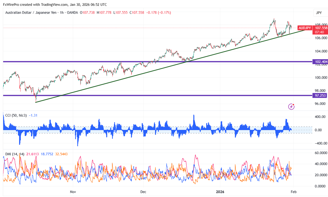 AUDJPY trades highly volatile with a positive bias. The intraday trend is upward as long as support 106 holds. It hits an intraday high of 108.57 and is currently trading around 107.65.