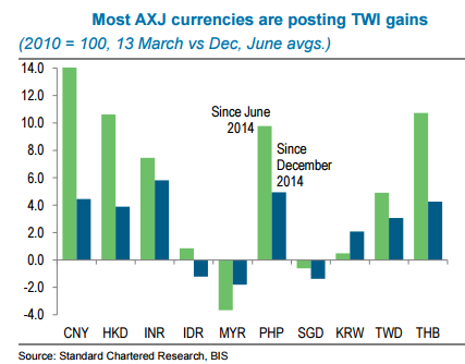- Based on market pricing at the Asian close on Friday, seven of the 10 widely traded AXJ currencies had posted net TWI gains since June and December 2014.