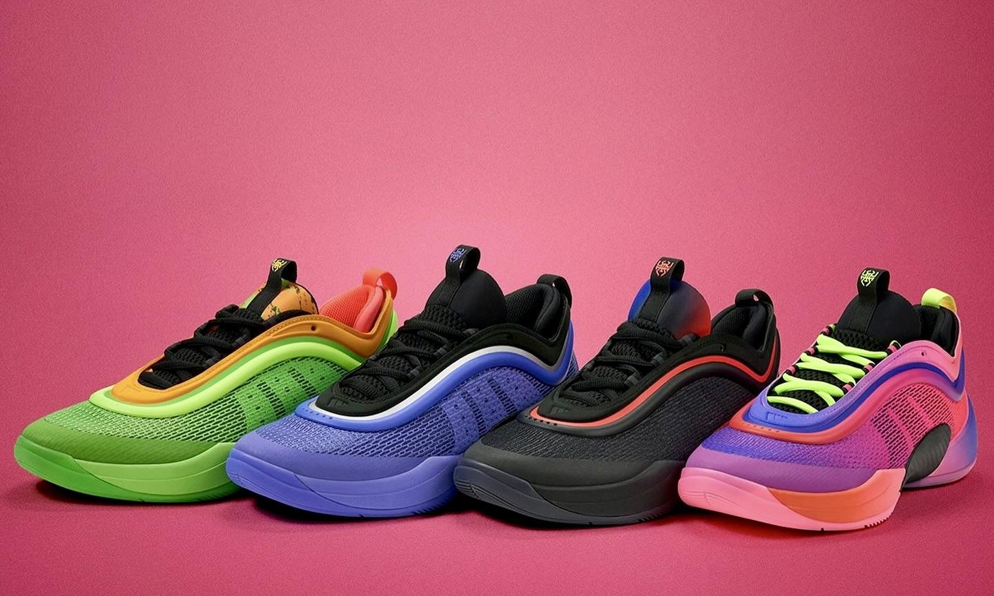 In an effort to please a wide range of customers, the rollout selection includes both bold color palettes and more subdued styles. Both the violet/black colorway shown during All-Star Weekend and the multi-colored pair that Mitchell debuted during the playoffs last season are appropriate for the event.