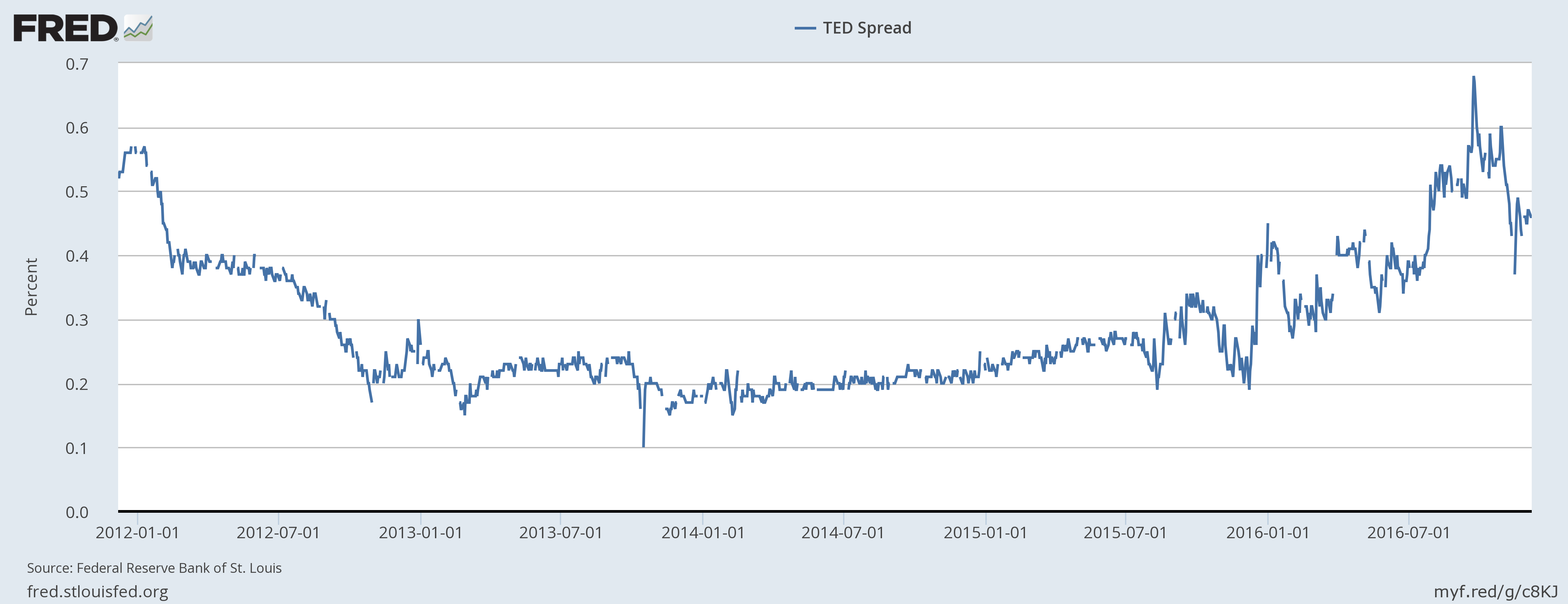 We, at FxWirePro, would keep a close watch over the next few days on the TED spread along with some other instruments. TED spread is the difference between the yield on 3-month Treasury bill and rates on interbank loans, which is represented by London Interbank Offered Rate (LIBOR). LIBOR bottomed in 2014 around 0.22 percent and jumped sharply from 0.32 percent to 0.61 percent in late 2015. After consolidating through the early half of the year, 3-month USD LIBOR started rising from 0.62 percent in July to 0.96 percent as of now, which is the highest level since the 2008/09 crisis. Similar rise happened last year before the Fed hike of 25 basis points in December, if that is the case then there is little to worry other than the higher interest rates. But if LIBOR continues to rise along with the TED spread, which can be read as the market demanded risk premium for holding loans other than the secured treasuries, it could point to funding shortage in the market along with the rise in the risk perception.