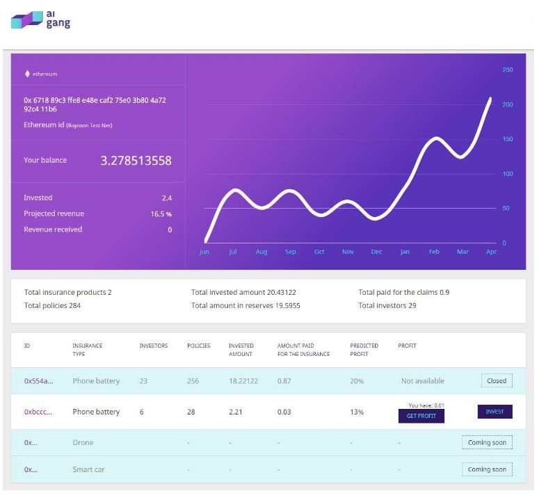 The Aigang investment platform provides users with an investor dashboard, representing the user profile which includes information about their contributions, projected profits, risk, and the status of each pool. Meanwhile, those purchasing the tokens will be able to trade them in secondary markets and make profits out of it. Some of its other functions include collection and monitoring of premiums, processing claims, and payouts.