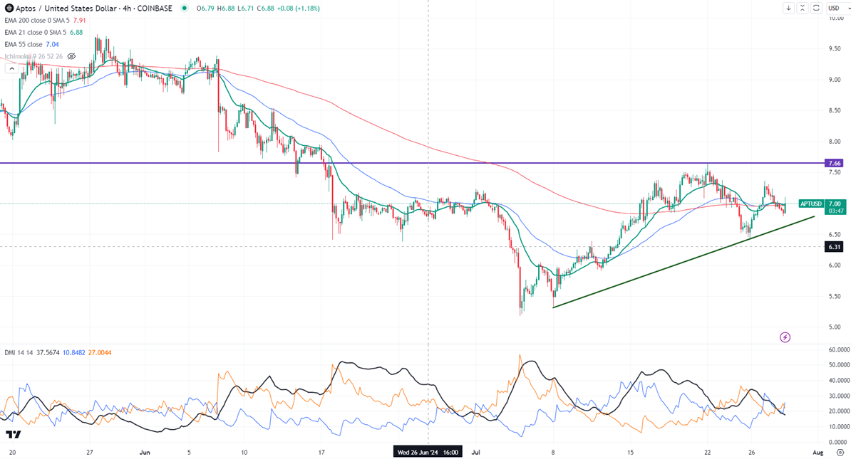 APTUSD prices pared some of its gains after a minor pullback. It hit a high of $7.36 and is currently trading around $7.06. The pair is holding above the short-term (21 and 55-day EMA) and above the long-term moving average (200-day EMA).