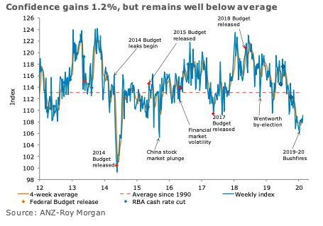 "The ANZ Roy-Morgan Australian Consumer Confidence index has risen to its highest level in 2020, with sentiment possibly buoyed by the continued gains in asset prices. The fact the coronavirus hasn’t become established in Australia might be a contributing factor, although the measures taken by the Government to help ensure this remains the case will have economic consequences. This week the key domestic influences on sentiment will be wage and employment data. We aren’t expecting the news to be flash, which may see confidence dip over the coming week and so continue the up and down behaviour seen in recent weeks," said David Plank, ANZ’s Head of Australian Economics.