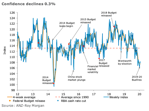 "Confidence declined modestly last week, despite the strong employment number. The news flow around the coronavirus and the potential implications for Chinese and Australian growth likely acted as a material offset to the more positive local news. There are a number of unusual influences on sentiment at present, such as the bushfires and coronavirus and the offsetting impact of strength in the labour market. This makes it more difficult than usual to assess how consumer spending will respond. We think this difficulty will see the RBA opting to wait for more information before it considers a further reduction in the cash rate," said David Plank, ANZ’s Head of Australian Economics.