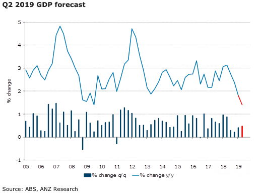After the release of key partial indicators this week, Australia’s gross domestic product (GDP) for the second quarter of this year is expected to rise 0.5 percent q/q. This would see annual growth edge down to 1.4 percent which would be the slowest pace since the GST, according to the latest report from ANZ Research.