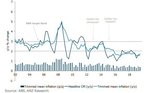 The Reserve Bank of Australia’s preferred measure of inflation, trimmed mean inflation, came in at 0.4 percent on a quarter-on-quarter basis, which saw the annual number unchanged at 1.6 percent. The RBA, in its August SoMP, had projected the trimmed mean inflation at 1.6 percent year-on-year in December 2019, suggesting an average of 0.4 percent for the third and fourth quarters. Therefore, a print of 0.4 percent is consistent with its expectation and will not cause it any additional concern, noted ANZ in a research report.