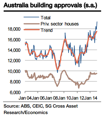 Societe Generale says that the approvals data continue to point to solid growth in residential construction activity in coming months and quarters, which is vitally important as a counterweight to the rapidly declining investment in mining.