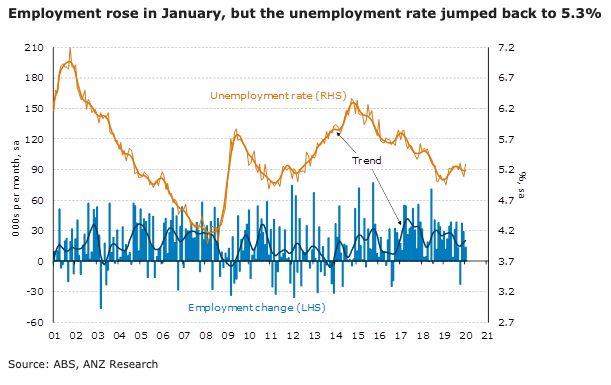 In a reversal of December’s move, Australia’s unemployment rate ticked back up to 5.3 percent in January, while employment rose modestly. The underutilisation rate jumped to a 19-month high. Alongside this, the participation rate edged back to 66.1 percent, just shy of the record high of 66.2 percent recorded in August last year.