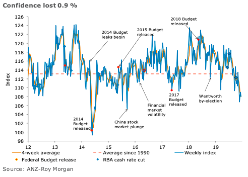 Australia’s ANZ-Roy Morgan consumer confidence fell 0.9 percent last week, primarily due to the 6.4 percent fall seen in the ‘Time to buy a major household item’ sub-index.