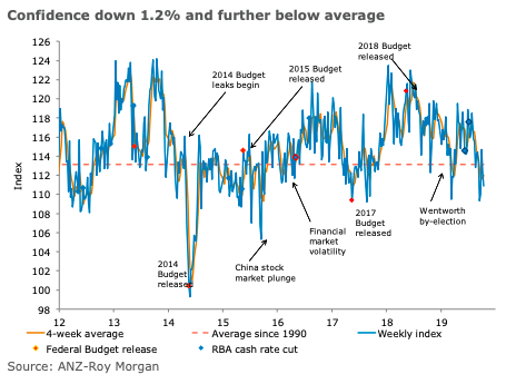 Australia’s ANZ Roy Morgan consumer confidence index was down 1.2 percent last week, its second straight weekly loss – ensuring confidence remains below its long-run average.