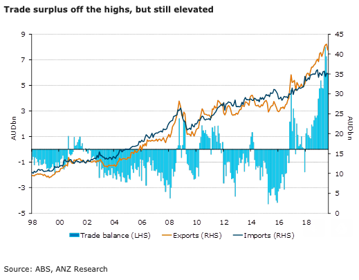 The monthly trade surplus dipped to AUD5.9 billion, still high but down from July’s revised surplus of AUD7.3 billion. Underlying this was a 3.4 percent m/m decline in exports, while imports were down 0.4 percent m/m.