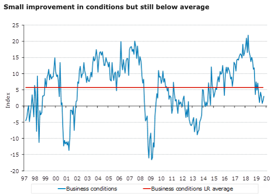 Business conditions recorded another small improvement in October, hitting a three-month high of +3.0, but it is too early to tell if this will be sustained. Confidence also rose slightly to +1.7. Forward orders (up 5.1pts), profitability (up 1.6pts) and trading (up 2.4pts) all rose.