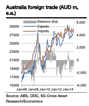 There is nothing wrong with the momentum in Australia's exports - with 3m-o-3m growth of 2.2% up to January (9% annualized) - especially considering the persistent weakness of commodity and hence export prices; but owing to surprising strength in imports the trade deficit has again been widening, and is likely to continue to have done so again in February.