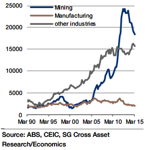 "Much attention is likely to be paid to capex plans for FY 15/16, which began in June. It is hard to imagine that capex plans in the mining sector will have deteriorated even further from the -35% revealed in the Q1 survey, but not much improvement is expected either. In contrast, it is difficult to believe that capex plans in the services sector are really as weak as the Q1 survey suggested (-10% in 2015/16 compared with 2014/15), some improvement is awaited here", added Societe Generale.