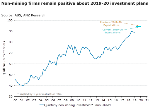 For 2019-20, capex plans were upgraded to AUD113 billion in Q2 from AUD99 billion in Q1. Part of this reflects the fact that businesses almost always upgrade their intentions at this time as the current financial year is underway.