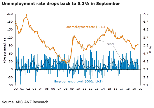The 14.7k rise in employment in September was the smallest in seven months, aside from the post-election correction in June. However, the 0.1ppt fall in the participation rate to 66.1 percent meant that it was enough to bring the unemployment rate back down to 5.2 percent, ANZ Research reported.