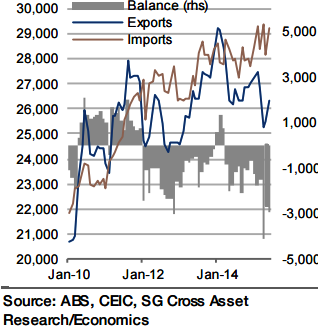 "Still, China's July figures for imports from Australia jumped to -4.5% yoy from - 26.5% in June, a move that can only partly be explained by a base effect. Overall, a muted 0.5% increase is expected in exports. As a consequence, the trade deficit should only improve fractionally", says Societe Generale.