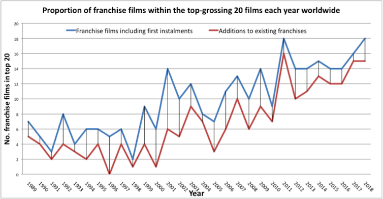 This graph shows the increasing success of franchise films over the past few decades. Looking at the 20 highest-grossing films worldwide each year since 1989, the graph shows two clear spikes and a gradual increase in franchise films since 2001.
