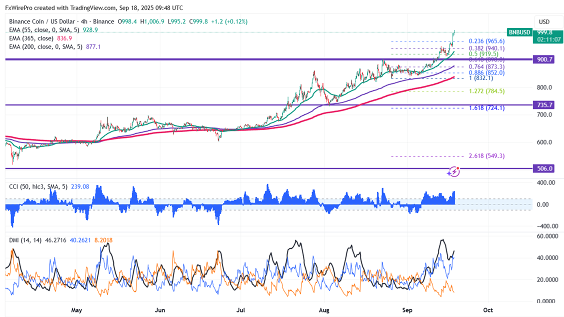 BNBUSD hits a fresh all-time high as demand for riskier assets increases. It hits an intraday high of $1006.90 and is currently trading around $996.10.