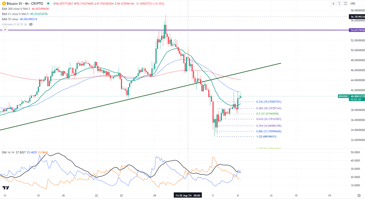BSVUSD prices have surged more than 25% in the past two days. It hit a high of $41.77 yesterday and is currently trading around $40.90. The pair holds above the short-term (21 and 55-day EMA) and the long-term moving average (200-day EMA).