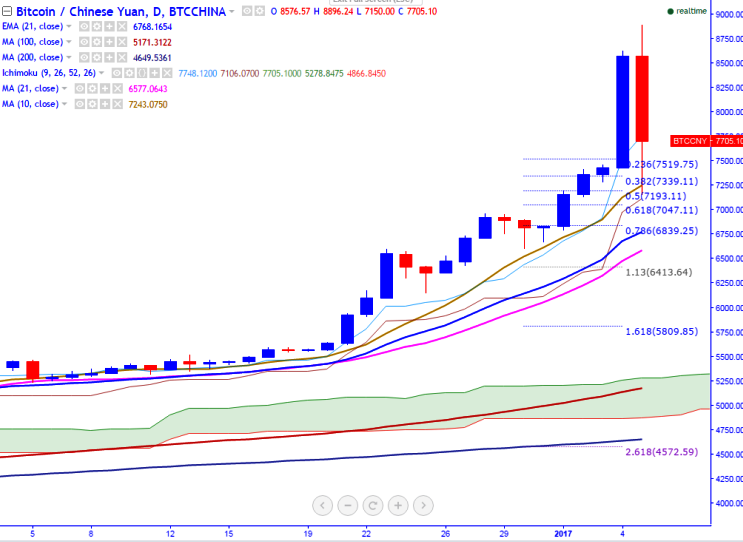 BTC/CNY is seen trading below on Thursday. The pair has fallen drastically after showing a jump till 8896 (BTCCCHINA). It is currently trading around 7389.40 at the time of writing.