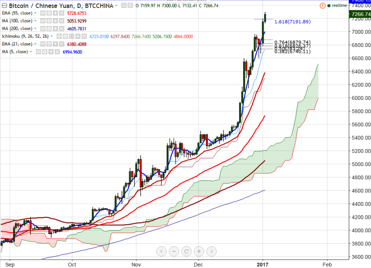 BTC/CNY is seen trading above on Monday. The pair has broken the psychological resistance at 7000 and jumped sharply till 7300 levels (BTCCCHINA). It is currently trading around 7262 at the time of writing.