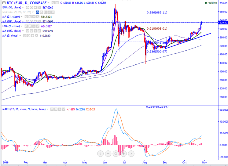 BTC/EUR is seen trading well above on Thursday. The pair breaks major resistance at 623 and jumped till the 632.09 levels (COINBASE).It is currently trading around 631.59 at the time of writing.