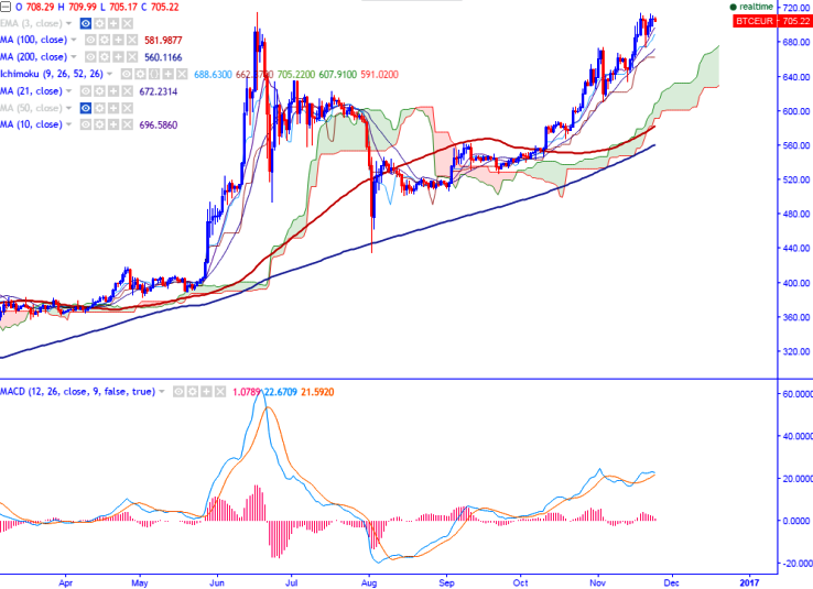 Long-term trend remains to be bullish. In the daily chart, BTC/EUR is facing strong resistance around 715 and any break above confirms minor bullishness.