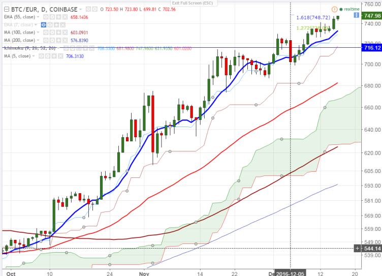 BTC/EUR is seen trading well above on Friday. The pair breaks minor resistance at 742 and jumped till 747.87 yesterday (COINBASE). It is currently trading around 747.53 at the time of writing.