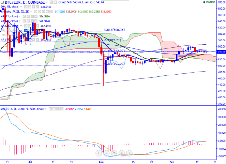 BTC/EUR is seen trading slightly above on Friday. The pair is trading in a narrow range in between 548 and 540 for the past three trading days (COINBASE). It is currently trading around 543.50 at the time of writing.