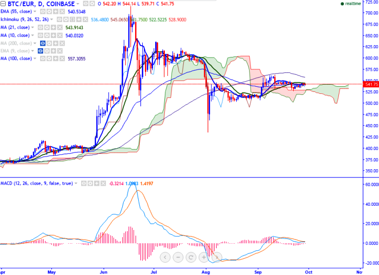 BTC/EUR is seen trading below in red on Thursday. The pair is trading narrow range between 545 and 535 for the past three trading session (COINBASE). It is currently trading around 541.44 at the time of writing.