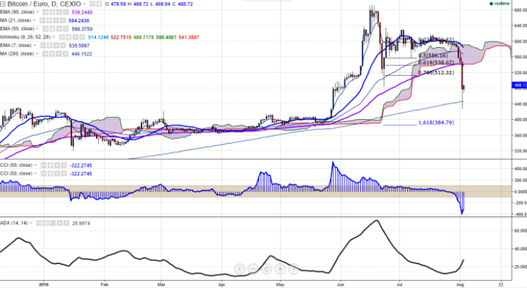 BTC/EUR is seen trading above on Wednesday after witnessing a plunge. The pair has broken major psychological support at 500 and declined till 427 levels (CEXIO) yesterday. It is currently trading at 489.20 at the time of writing.