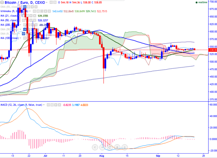 BTC/EUR is seen trading low in red on Wednesday. The pair has declined slightly from the high of 546.29 made yesterday (CEXIO). It is currently trading around 538.55 at the time of writing.