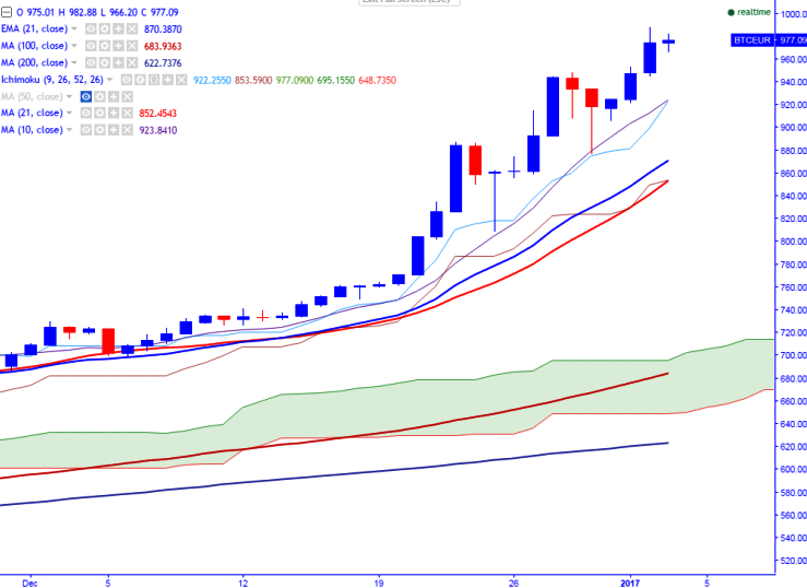 BTC/EUR kicked off the New Year by jumping till 988.58 yesterday and is expected to break psychological level in the short term (COINBASE). The pair has slightly declined till 951.30 after making fresh lifetime high. It is currently trading around 977 at the time of writing.
