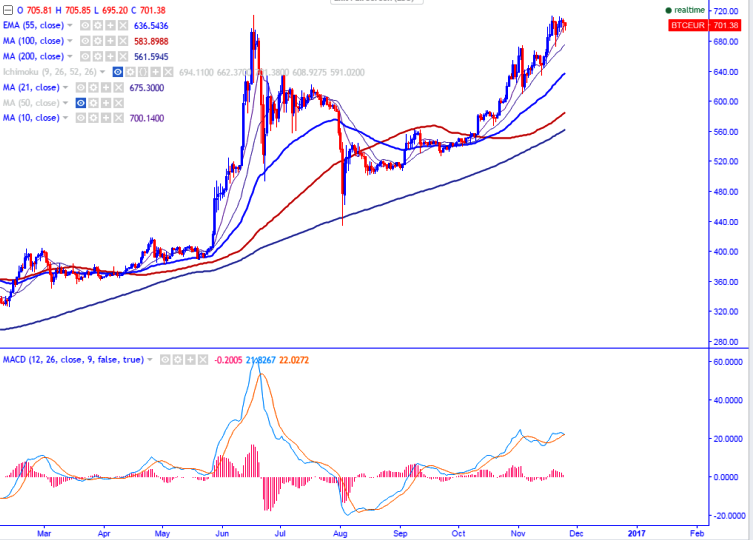 Long-term trend remains to be bullish. In the daily chart, BTC/EUR is facing strong resistance around 715 and any break above confirms minor bullishness.