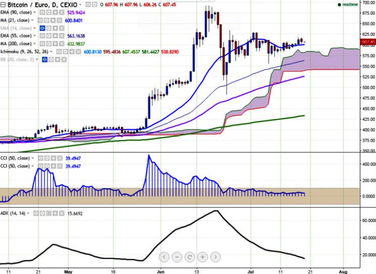 BTC/EUR is seen trading in red on Tuesday. The pair has slightly retreated after making a high of 618 levels (CEXIO). It is currently trading at 607.44 at the time of writing.