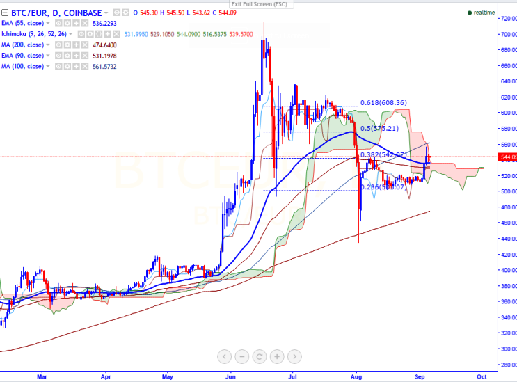 BTC/EUR is seen trading well above on Tuesday. The pair has recovered sharply from the low of 507.09 made on Sep 2nd 2016 (COINBASE). It is currently trading around 544 at the time of writing.