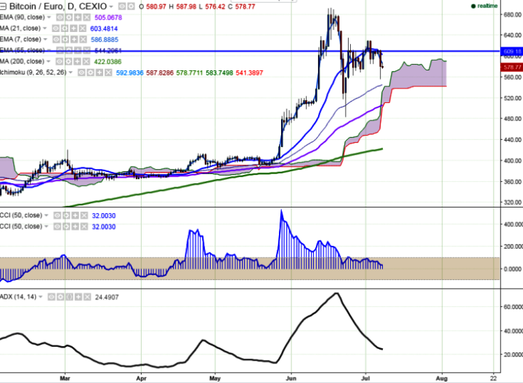 Long term trend remains to be bullish. BTC/EUR trades well below daily Tenken-Sen and Kijun-Sen. So a decline till 543/505 is possible.