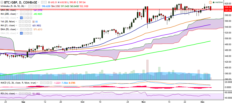 BTC/GBP has broken below the 600 mark and is currently trading in the red at 596.88 levels at the time of writing (Coinbase).